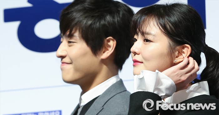 (서울=포커스뉴스) 12일 오전 서울 강남구 압구정 CGV에서 열린 영화 '좋아해줘' 제작보고회에 참석한 배우 강하늘(왼쪽)과 이솜이 포토타임을 갖고 있다.