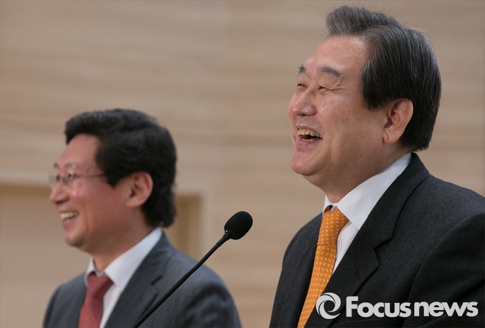 (서울=포커스뉴스) 12일 오후 서울 여의도 국회 의원회관에서 열린 주민자치 실질화 대토론회에 참석한 김무성 새누리당 대표가 축사 중 참석자의 발언을 듣고 웃고 있다. 왼쪽은 이상일 의원.