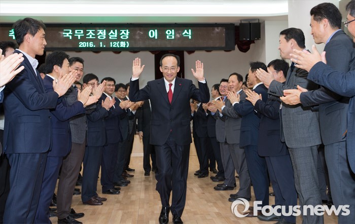 (세종=포커스뉴스) 추경호 국무조정실장이 12일 오후 세종시 정부세종청사 1동 대강당에서 열린 이임식에서 직원들의 박수를 받으며 청사를 나서고 있다.