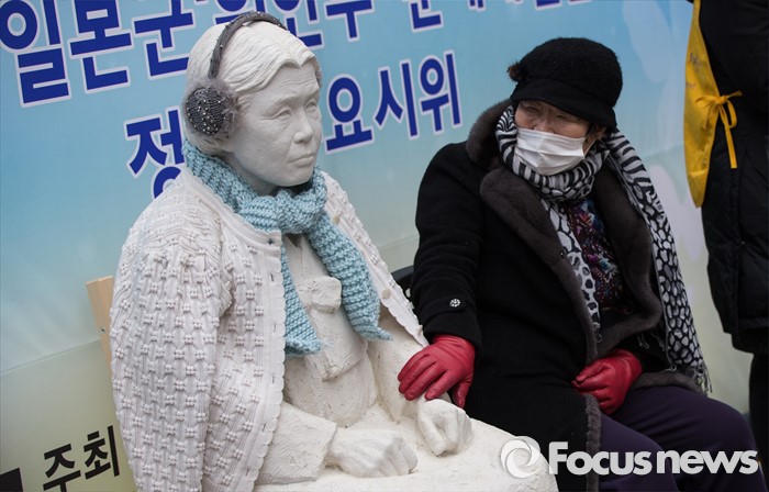 한편 조 대변인은 '소녀상' 이전 문제, 위안부 기록물의 유네스코 세계유산 등재 문제에서도 정부가 나서서 이래라저래라 할 사항은 아니라는 점을 다시 밝혔다.(서울=포커스뉴스) 6일 오후 서울 종로구 중학동 일본대사관 앞에서 열리는 일본군 위안부 문제 해결을 위한 수요시위가 24주년을 맞이한 가운데 위안부 피해 이용수(89) 할머니가 김학순 할머니의 동상을 어루만지고 있다.2016.01.06 김흥구 기자