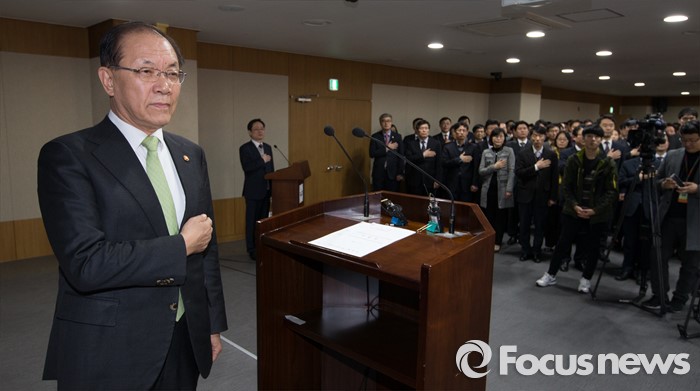 (세종=포커스뉴스) 황우여 사회부총리 겸 교육부장관이 12일 오후 세종시 정부세종청사 교육부 대회의실에서 열린 이임식에서 국기에 대한 경례를 하고 있다.