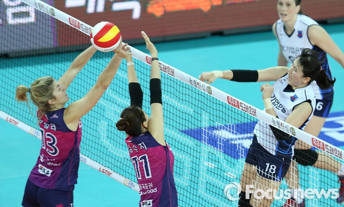 (인천=포커스뉴스) 12일 인천 계양체육관에서 열린 '2015-2016NH농협 V-리그' 여자부 흥국생명-IBK기업은행 경기에서 IBK기업은행 김유리가 흥국생명 테일러, 김수지의 블로킹을 뚫고 강스파이크를 날리고 있다.