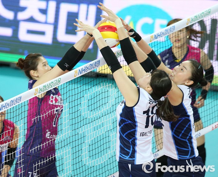 (인천=포커스뉴스) 12일 인천 계양체육관에서 열린 '2015-2016NH농협 V-리그' 여자부 흥국생명-IBK기업은행 경기에서 IBK기업은행 김사니, 김유리가 흥국생명 김수지와 네트위에서 서로 볼을 넘기고 있다.