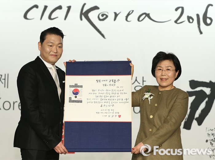 (서울=포커스뉴스) 12일 오후 서울 강남구 그랜드 인터컨티넨탈 호텔에서 한국이미지커뮤니케이션연구원(CICI) 주최로 열린 '12회 한국이미지상 시상식'에 한국 이미지 디딤돌상을 수상한 가수 싸이(왼쪽)와 최정화 CICI 대표가 포즈를 취하고 있다.