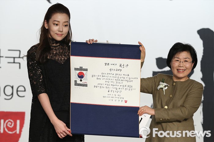 (서울=포커스뉴스) 12일 오후 서울 강남구 그랜드 인터컨티넨탈 호텔에서 한국이미지커뮤니케이션연구원(CICI) 주최로 열린 '12회 한국이미지상 시상식'에 한국 이미지 꽃돌상을 수상한 바이올리니스트 클라라 주미강(왼쪽)과 최정화 CICI 대표가 포즈를 취하고 있다.