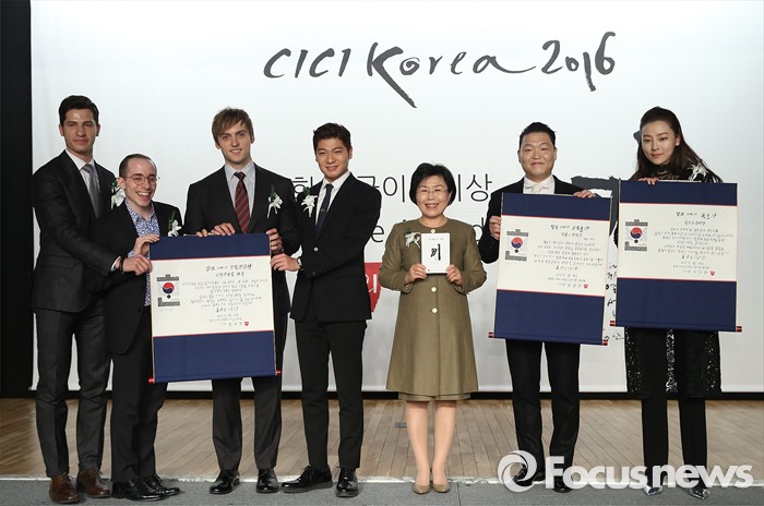 (서울=포커스뉴스) 12일 오후 서울 강남구 그랜드 인터컨티넨탈 호텔에서 한국이미지커뮤니케이션연구원(CICI) 주최로 열린 '제 12회 한국이미지상 시상식'에 수상자들이 포토타임을 갖고 있다. 왼쪽부터 알베르토 몬디, 타일러 라쉬, 기욤 패트리, 장위안, 최정화 CICI 대표, 가수 싸이, 바이올리니스트 클라라 주미강.