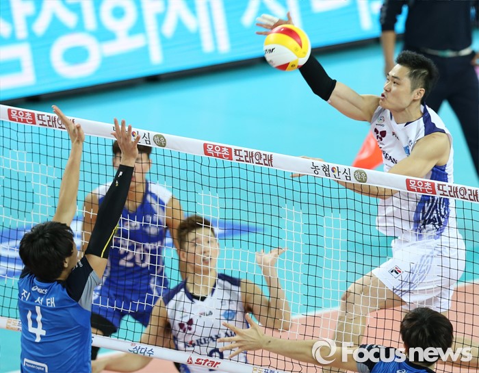 (인천=포커스뉴스) 12일 인천 계양체육관에서 열린 '2015-2016NH농협 V-리그' 남자부 대한항공-현대캐피탈 경기에서 대한항공 김철홍이 현대캐피탈의 블로킹을 따돌리며 스파이크를 하고 있다.