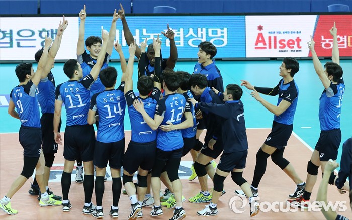 (인천=포커스뉴스) 12일 인천 계양체육관에서 열린 '2015-2016NH농협 V-리그' 남자부 대한항공-현대캐피탈 경기에서 오레올이 스파이크 서브로 마지막 득점을 올려 세트스코어 3-2로 승리한 현대캐피탈 선수들이 환호하고 있다.