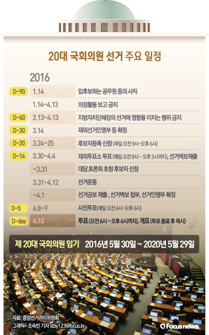 (서울=포커스뉴스) 오는 14일 입후보하는 공무원 등의 사직을 시작으로 20대 국회의원 선거 주요 일정이 진행된다.