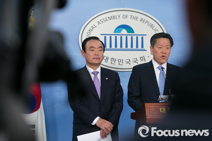 (서울=포커스뉴스) 더불어민주당 주승용(오른쪽), 장병완 의원이 13일 오전 서울 여의도 국회 정론관에서 탈당 표명 기자회견을 하고 있다.