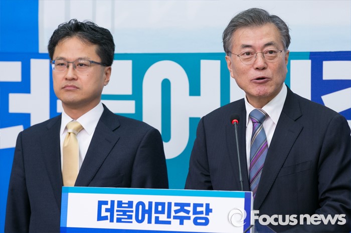 (서울=포커스뉴스) 문재인(오른쪽) 더불어민주당 대표가 13일 오전 서울 여의도 국회에서 재정부 국고국 과장 역임한 국가재정 전문가 김정우(왼쪽) 세종대 교수의 입당식에 참석해 인사말을 하고 있다. 김 교수의 부친은 김철배 더민주 강원도당 고문으로 12대 총선부터 15대 총선까지 5번(보선 1회 포함)을 철원, 화천, 양구 지역에서 범민주당의 이름으로 출마해, 5번 내리 낙선했다.