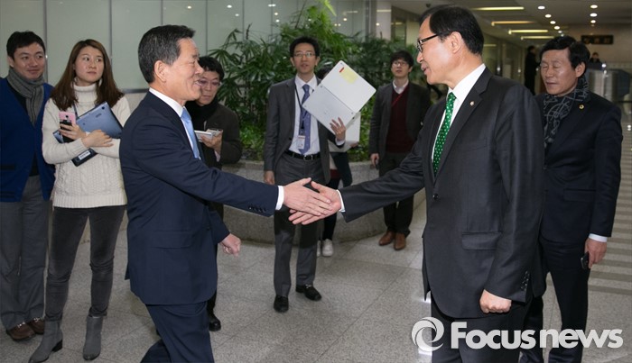 (서울=포커스뉴스) 13일 오전 서울 여의도 국회 정론관에서 주승용(왼쪽) 더불어민주당 의원이 탈당 기자회견에 앞서 탈당 후 국민의당에 합류한 문병호 의원과 인사하고 있다.