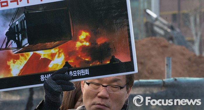 (서울=포커스뉴스) 13일 오전 서울 용산구 남일당 주차장에서 열린 '용산참사 7주기 추모주간 선포' 기자회견에 참석한 용산참사7주기 추모위원회원들이 당시 참사현장의 사진이 있는 손팻말을 들고 있다.