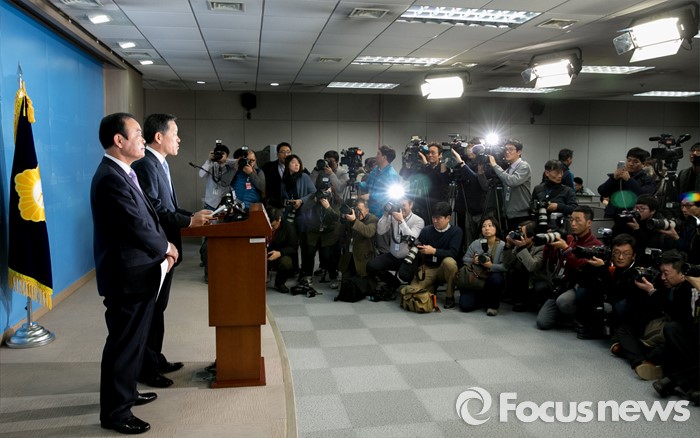 (서울=포커스뉴스) 13일 오전 서울 여의도 국회 정론관에서 장병완(왼쪽), 주승용 더불어민주당 의원이 탈당 기자회견을 하고 있다.