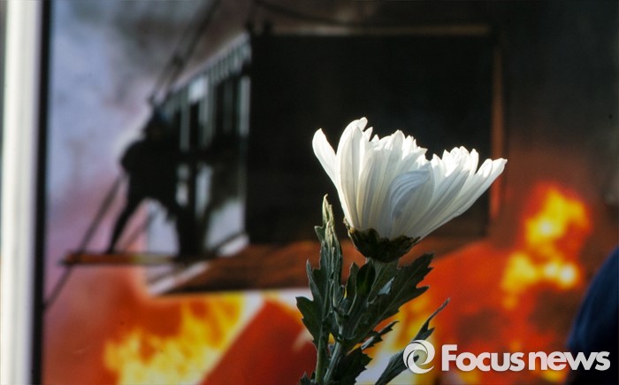 (서울=포커스뉴스) 13일 오전 서울 용산구 남일당 주차장에서 열린 '용산참사 7주기 추모주간 선포' 기자회견에 참석한 용산참사7주기 추모위원회원이 당시 참사현장의 사진이 있는 손팻말과 국화를 들고 있다.