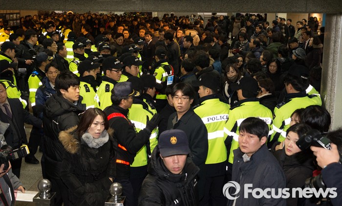 (서울=포커스뉴스) 누리과정 예산을 포함한 올해 예산안 심의를 위한 임시회 본회의 예정일인 13일 오전 경기도의회에서 경기도사립유치원연합회 회원들이 더불어민주당 의원총회가 열리는 대회의실 문 앞을 막자 경찰이 투입되어 길을 만들고 있다.