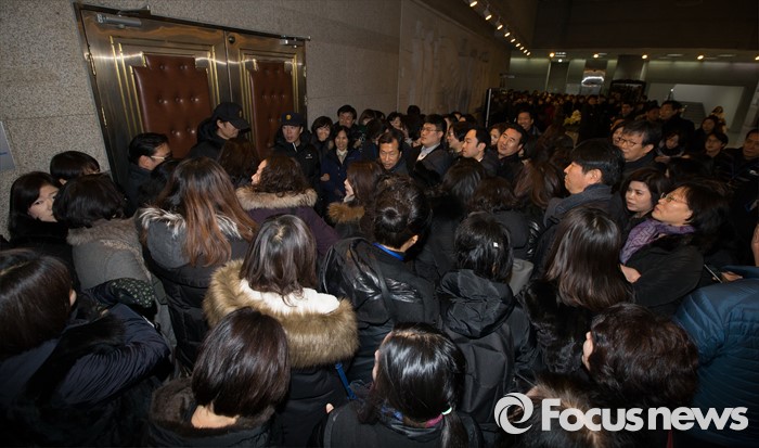(서울=포커스뉴스) 누리과정 예산을 포함한 올해 예산안 심의를 위한 임시회 본회의 예정일인 13일 오전 경기도의회에서 경기도사립유치원연합회 회원들이 더불어민주당 의원총회가 열리는 대회의실 문 앞을 막자 경찰이 투입되어 길을 만들고 있다.
