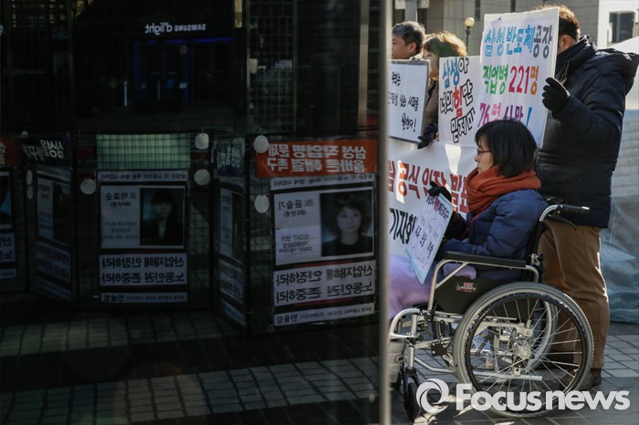 (서울=포커스뉴스) 13일 오전 서울 서초구 삼성전자 본관 앞에서, 반도체 노동자의 건강과 인권지킴이(반올림) 회원과 피해자 가족들이 전날 열린 조정위원회 합의 내용에 대한 입장을 밝히며 사과 및 보상 문제에 대한 조속한 해결을 촉구하고 있다.