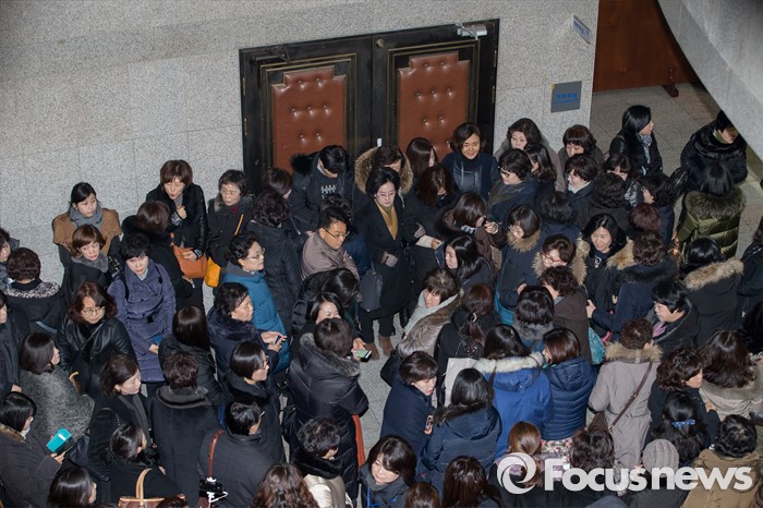 (서울=포커스뉴스) 누리과정 예산을 포함한 올해 예산안 심의를 위한 임시회 본회의 예정일인 13일 오전 경기도의회에서 경기도사립유치원연합회 회원들이 더불어민주당 의원총회가 열리는 대회의실 문 앞을 막고 있다.