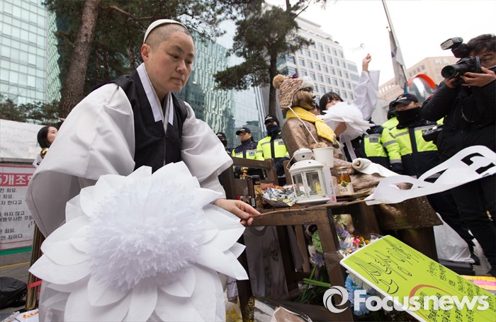 (서울=포커스뉴스) 13일 오후 서울 종로구 구 일본대사관 앞에서 수요예술행동 회원들이 한일 협상 무효 수요행동을 하고 있다.
