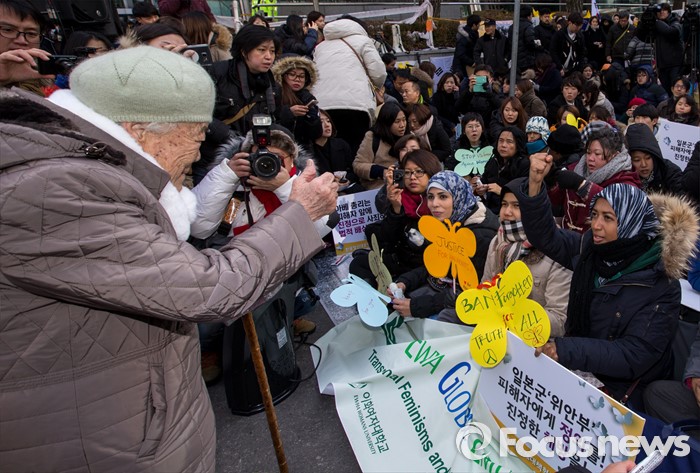 (서울=포커스뉴스) 13일 오후 서울 종로구 옛 일본대사관 앞에서 열린 제1213차 정기수요집회 앞서 열린 한일 일본군 위안부 합의 무효 기자회견에서 일본군 위안부 피해자 이옥선 할머니가 외국인 참가자와 인사하고 있다.