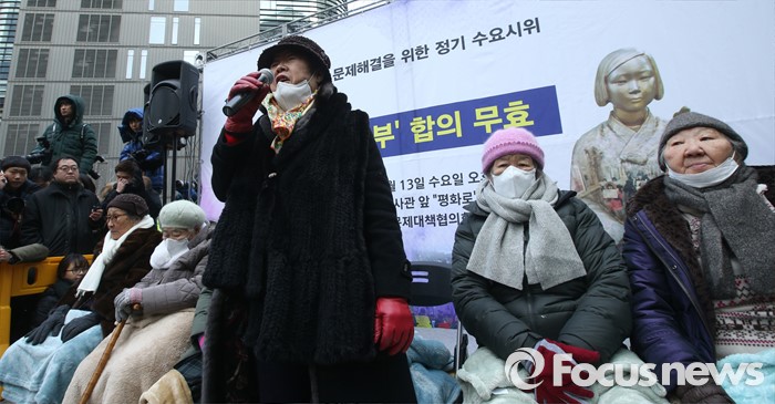 (서울=포커스뉴스) 13일 오후 서울 종로구 옛 일본대사관 앞에서 열린 제1213차 일본군 위안부 피해자 문제 해결 위한 정기 수요시위에 자리한 피해자 할머니들이 발언 하고 있다.