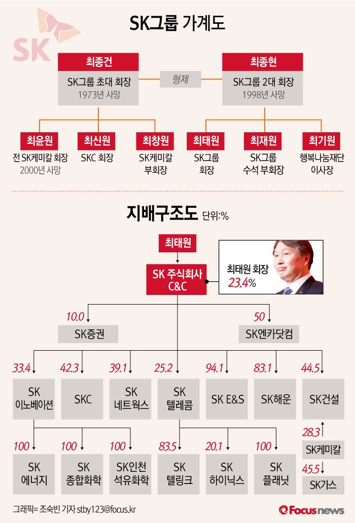 (서울=포커스뉴스) SK그룹의 지배구조는 지난해 7월 합병을 통해 탄생한 SK㈜ C&C를 통해 그룹 전체를 지배하는 형태다. 최태원 회장은 SK㈜ C&C의 지분 23.4%를 보유한 최대주주다.