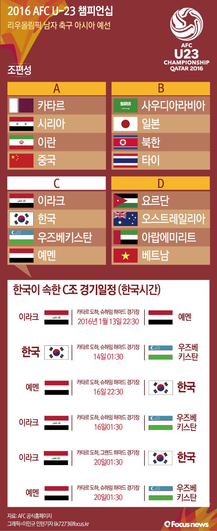 한국은 14일 새벽 1시30분(이하 한국시간) 카타르 도하 슈하임 빈 하마드 스타디움에서 우즈벡을 상대로 2016 아시아축구연맹(AFC) U-23 챔피언십 조별라운드 C조 첫 경기를 치른다. 이번 대회는 2016 리우올림픽 아시아예선을 겸하는 대회로 상위 3팀이 브라질 땅을 밟게 된다.