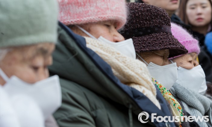 (서울=포커스뉴스) 13일 오후 서울 종로구 옛 일본대사관 앞에서 열린 제1213차 정기수요집회 앞서 열린 한일 일본군 위안부 합의 무효 기자회견에서 일본군 위안부 피해자 할머니들이 비통한 표정을 짓고 있다.