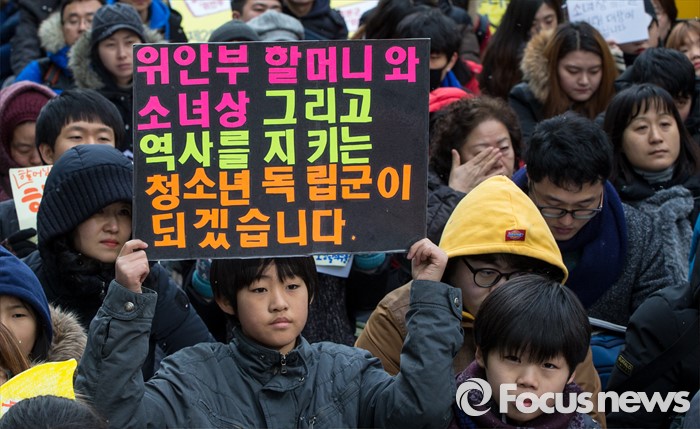 (서울=포커스뉴스) 13일 오후 서울 종로구 옛 일본대사관 앞에서 열린 제1213차 정기수요집회에 참석한 학생이 청소년 독립군이 되겠다느느 결의가 담긴 손팻말을 들고 있다.