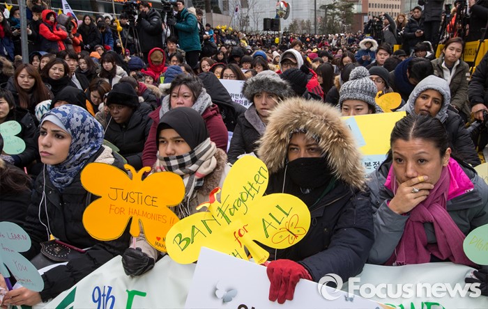 (서울=포커스뉴스) 13일 오후 서울 종로구 옛 일본대사관 앞에서 열린 제1213차 정기수요집회 앞서 열린 한일 일본군 위안부 합의 무효 기자회견에서 외국인 참가자들이 일본군 위안부 피해자 강일출 할머니가 발언을 경청하고 있다.
