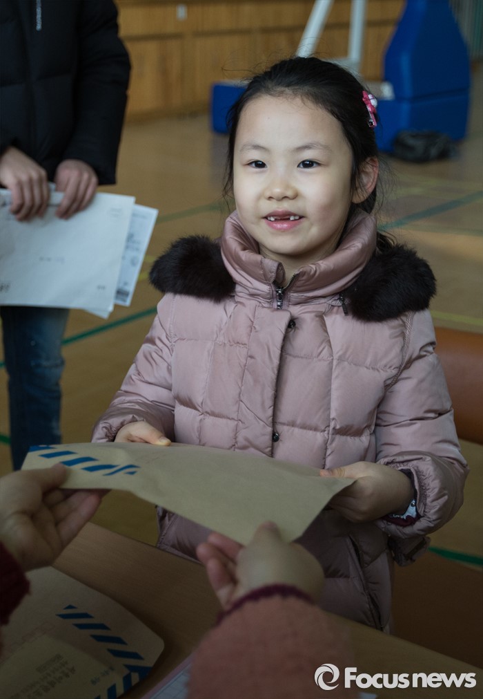 (서울=포커스뉴스) 초등학교 신입생 예비소집일인 13일 오후 서울 용산구 이태원초등학교에서 예비 초등학생이 선생님에게 입학 안내서를 받고 있다.