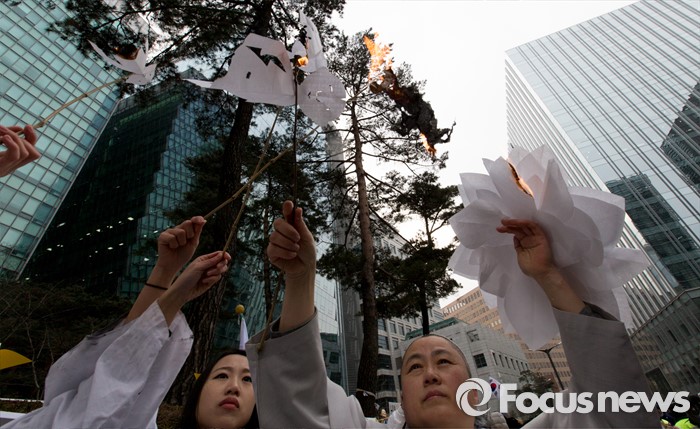 (서울=포커스뉴스) 13일 오후 서울 종로구 구 일본대사관 앞에서 수요예술행동 회원들이 한일 협상 무효 수요행동을 하고 있다.