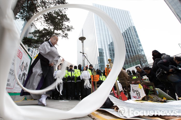 (서울=포커스뉴스) 13일 오후 서울 종로구 구 일본대사관 앞에서 수요예술행동 회원들이 한일 협상 무효 수요행동을 하고 있다.
