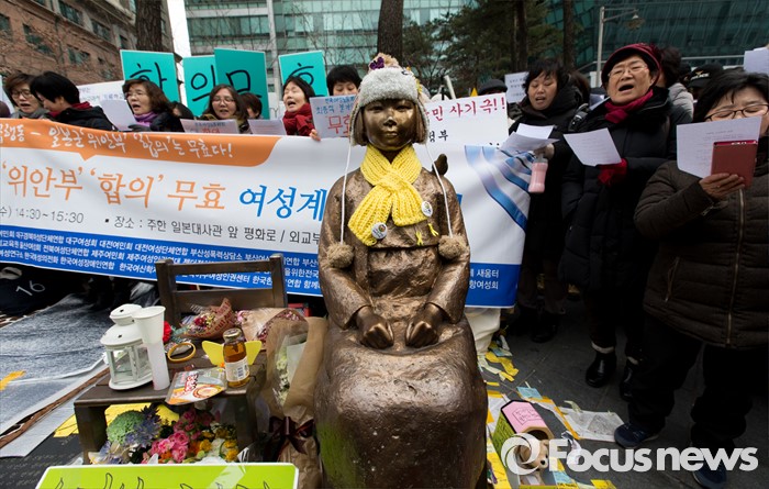 (서울=포커스뉴스) 13일 오후 서울 종로구 구 일본대사관 앞에서 한국여성단체연합이 한일 일본군 위안부 합의 규탄 기자회견을 하고 있다.