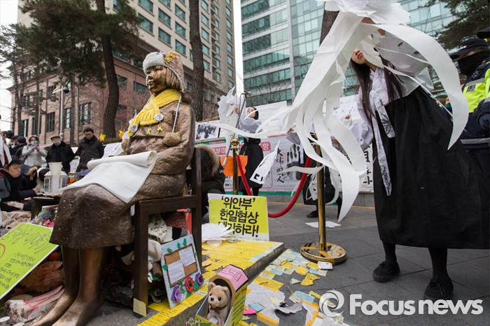 (서울=포커스뉴스) 13일 오후 서울 종로구 구 일본대사관 앞에서 수요예술행동 회원들이 한일 협상 무효 수요행동을 하고 있다.