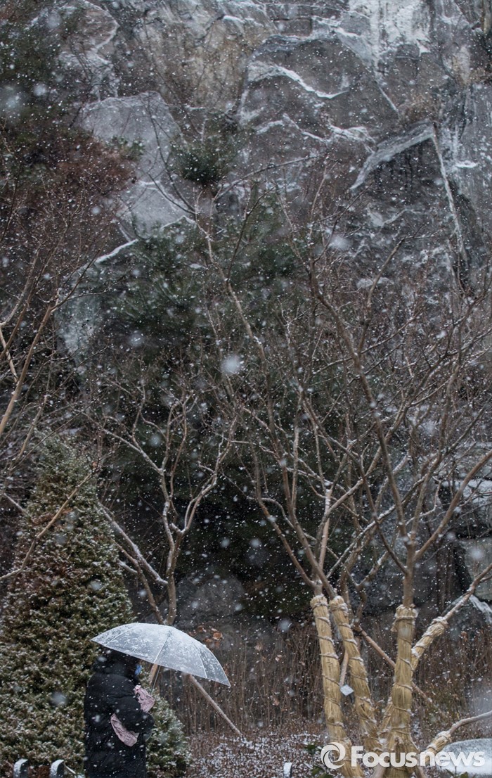 (서울=포커스뉴스) 서울을 포함한 중부지방에 많은 눈이 내린 13일 오후 서울 강북구의 생활도로에서 우산을 쓴 시민에 발걸음을 재촉하고 있다.