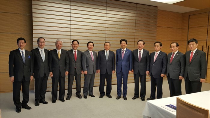 (서울=포커스뉴스) 13일(현지시간) 일본 도쿄 총리관저에서 서청원(오른쪽 네번째) 새누리당 최고위원을 비롯한 한일의원연맹 소속 여·야 의원들이 아베 신조(오른쪽 다섯번째) 일본 총리와 면담을 마치고 기념촬영을 하고 있다. <사진제공=서청원 의원실>