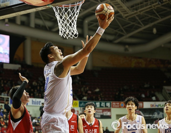 (안양=포커스뉴스) 13일 안양실내체육관에서 열린 2015-2016 프로농구 KGC-KCC 경기에서 KCC 하승진이 골밑에서 슈팅을 하고 있다.