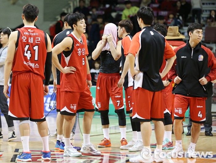 (안양=포커스뉴스) 13일 안양실내체육관에서 열린 2015-2016 프로농구 KGC-KCC 경기에서 경기 막판에 역전패 당한 KGC 선수들이 침울한 표정으로 플로어에 모여 있다.