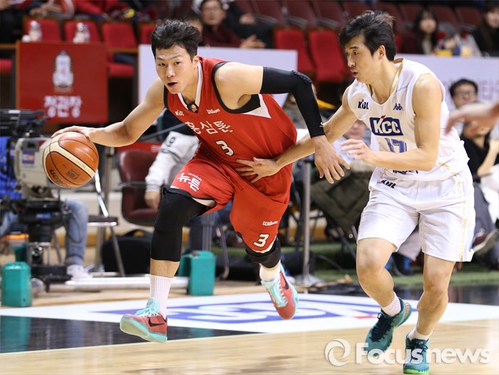 (안양=포커스뉴스) 13일 안양실내체육관에서 열린 2015-2016 프로농구 KGC-KCC 경기에서 KGC 이정현이 KCC 신명호의 마크를 받으며 돌파를 시도하고 있다.
