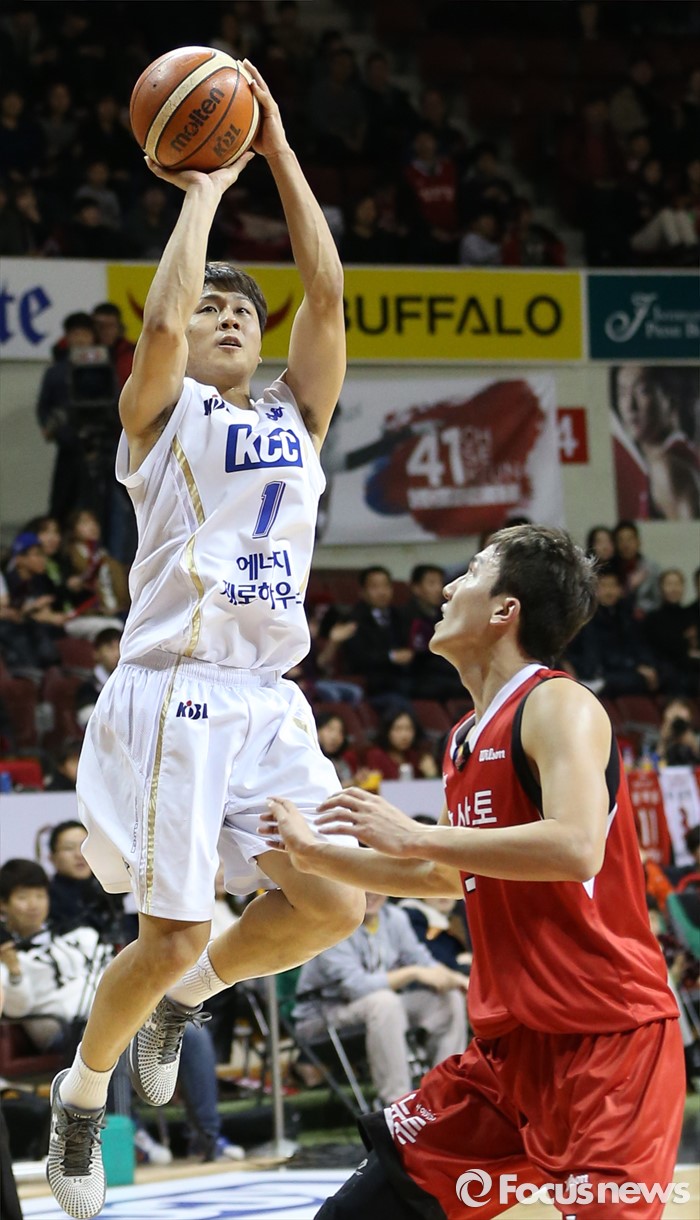 (안양=포커스뉴스) 13일 안양실내체육관에서 열린 2015-2016 프로농구 KGC-KCC 경기에서 KCC 김태술이 KCC 박찬희의 수비에 앞서 점프슛을 시도하고 있다.