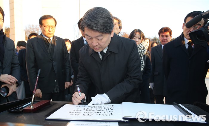 (서울=포커스뉴스) 14일 오전 서울 강북구 국립 4.19 민주묘지를 찾은 안철수 국민의당 인재영입위원장이 참배 후 방명록을 작성하고 있다.