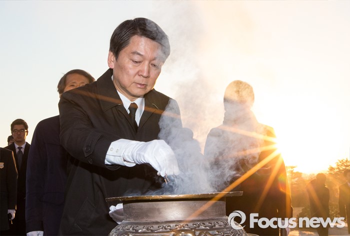 (서울=포커스뉴스) 14일 오전 서울 강북구 국립 4.19 민주묘지를 찾은 안철수 국민의당 인재영입위원장이 분향하고 있다.