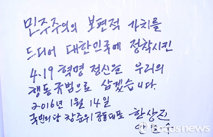 (서울=포커스뉴스) 14일 오전 서울 강북구 국립 4.19 민주묘지를 찾은 안철수 국민의당 인재영입위원장과 한상진 창당준비위원장이 작성한 방명록.