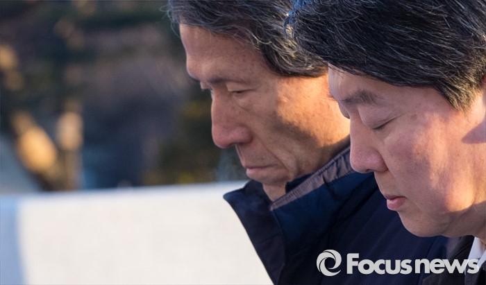 (서울=포커스뉴스) 14일 오전 서울 강북구 국립 4.19 민주묘지를 찾은 한상진(왼쪽 부터) 국민의당 창당준비위원장과 안철수 인재영입위원장이 분향 후 묵념하고 있다.