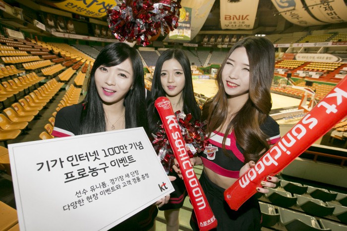 (서울=포커스뉴스) KT가 오는 16일 오후 6시 부산사직실내체육관에서 열리는 KT소닉붐과 LG세이커스의 경기에서 ‘기가 인터넷 100만 고객 달성’ 기념 이벤트를 개최한다.