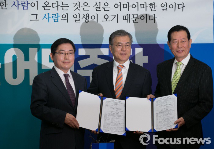 (서울=포커스뉴스) 문재인(가운데) 더불어민주당 대표가 14일 오전 서울 여의도 국회에서 인재영입 기자회견을 마친 뒤 하정열(오른쪽) 한국안보통일연구원장과 박희승 전 수원지법 안양지원장과 기념촬영을 하고 있다.
