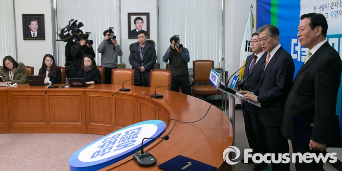 (서울=포커스뉴스) 문재인(가운데) 더불어민주당 대표가 14일 오전 서울 여의도 국회에서 하정열(오른쪽) 한국안보통일연구원장, 박희승 전 수원지법 안양지원장 인재영입 기자회견을 하고 있다.