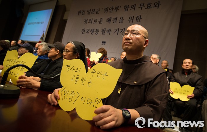 (서울=포커스뉴스) 한국정신대문제대책협의회와 시민사회단체가 14일 오후 서울 중구 프레스센터에서 시민사회단체와 학생, 예술 단체 등 사회각계각층이 참여하는 '한일 일본군 위안부 합의 무효와 정의로운 해결을 위한 전국행동' 발족 기자회견을 열고 있다.
